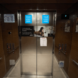 The express elevator brings attendees to the top floors of the hotel. (1 Elevator) Your logo/custom artwork will be placed on (1) 22×28 above the elevator (1) Signs inside elevator promoting your location.