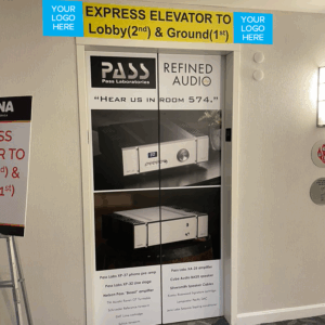 Going up? Going down? The majority of AXPONA attendees are in the elevator lobby waiting to change floors. Get your message seen. Put your art work and exhibit location on the exterior doors of the elevators for everyone to see!